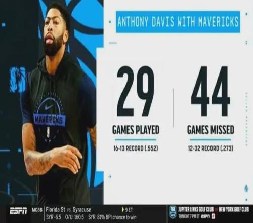 自上赛季中期到本赛季至今,浓眉哥仅为独行侠出战29场比赛,场均亮相30.8分钟,贡献20.2分10.8板3.3助1.8帽,三项命中率49.2%、25.4%和71.3%,当他披挂上阵时球队战绩16胜13负,缺席44场期间12胜32负。